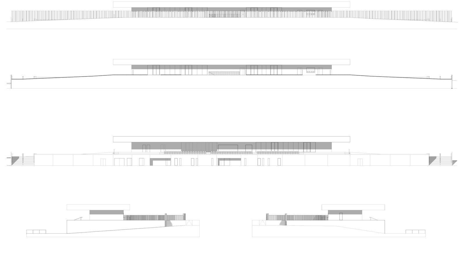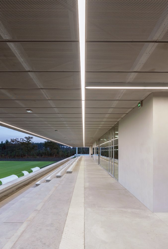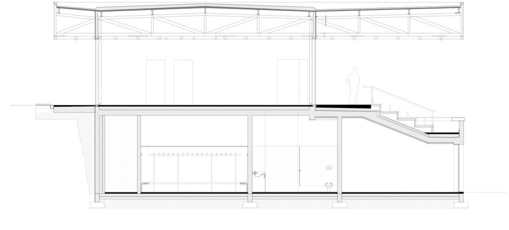 The stand emerges subtly from the ground, embedded into the site topography. The two levels of facilities absorb the natural slope of the site. This layout meets the functional requirements with facilities open to the public on the ground floor and spaces dedicated to sportsmen in continuity with the main playing field.