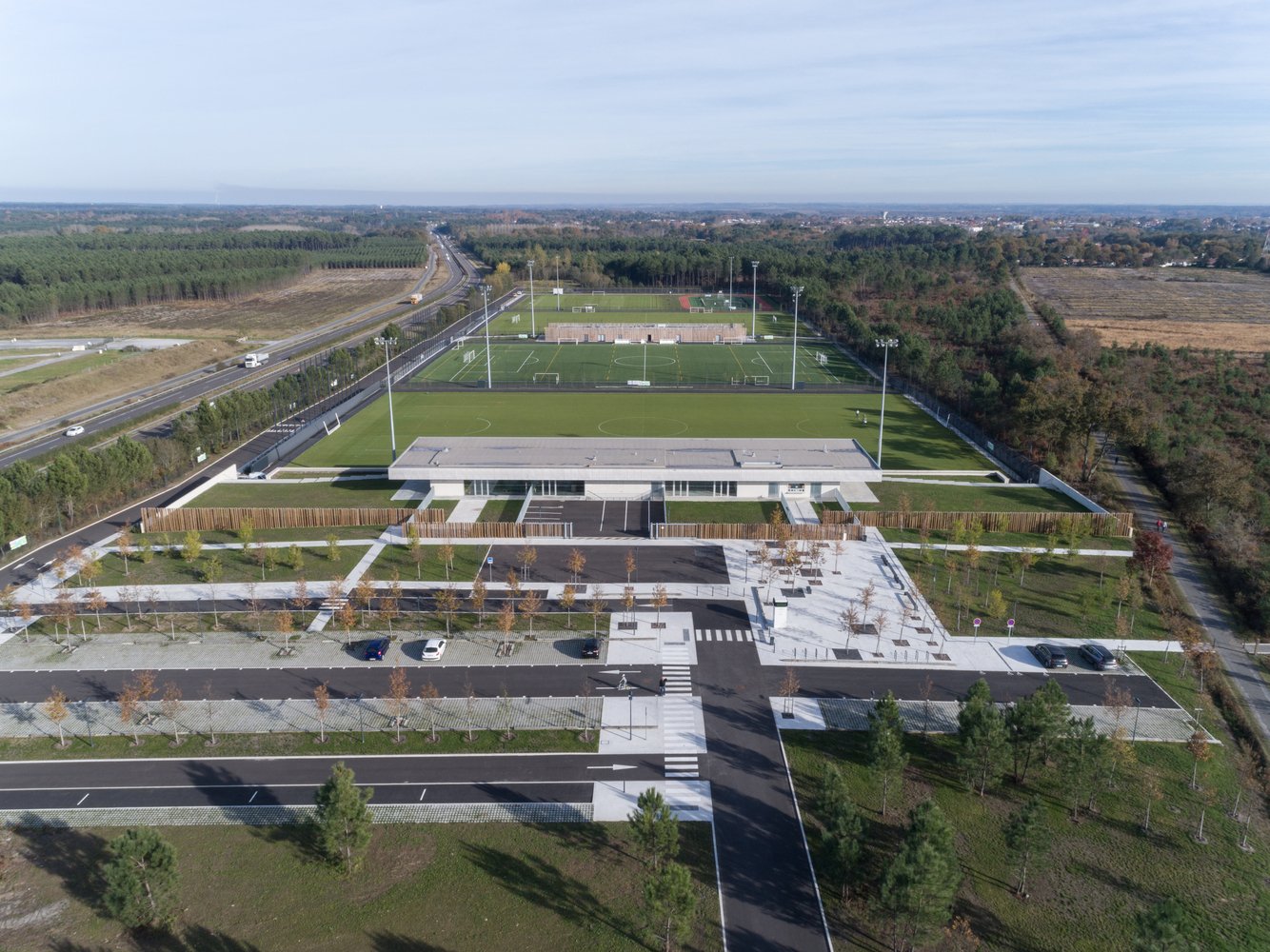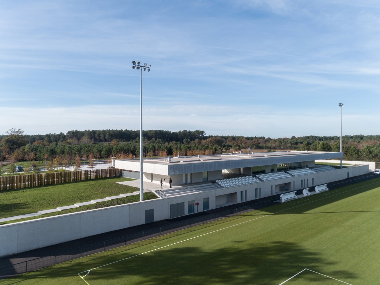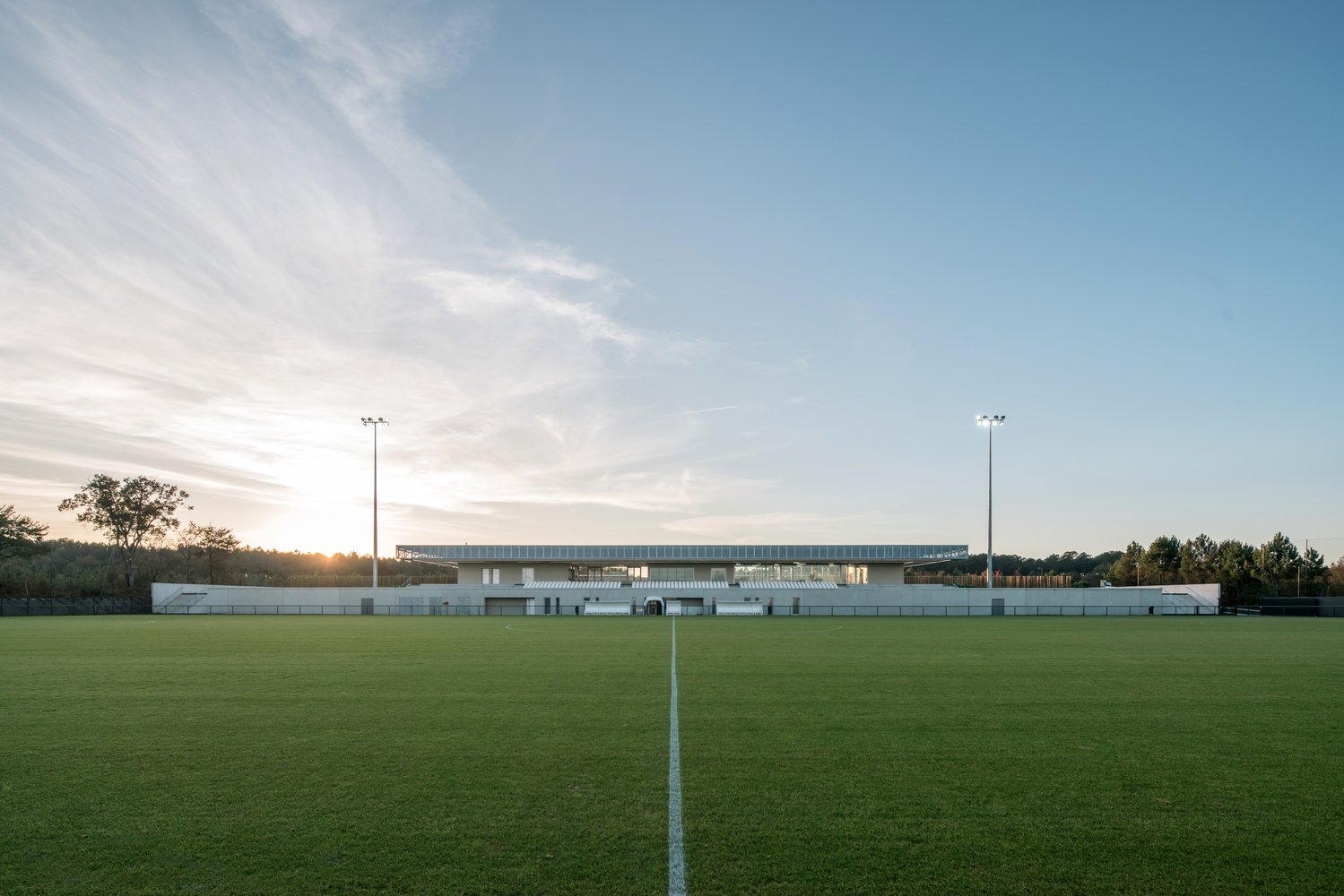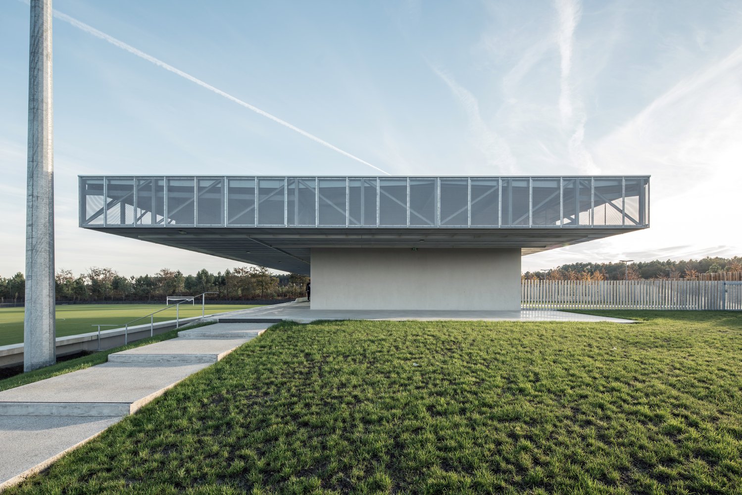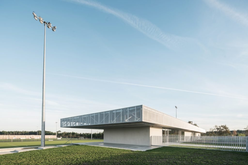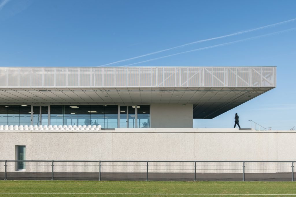 The stand acts as an architectural signal, a line in the landscape visible in both directions from the 824 Departmental Road. Perpendicular to the road, its location makes it visible in a “green tracking”, a careful balance between planting and the presence of technical equipment (lighting masts, ball nets).