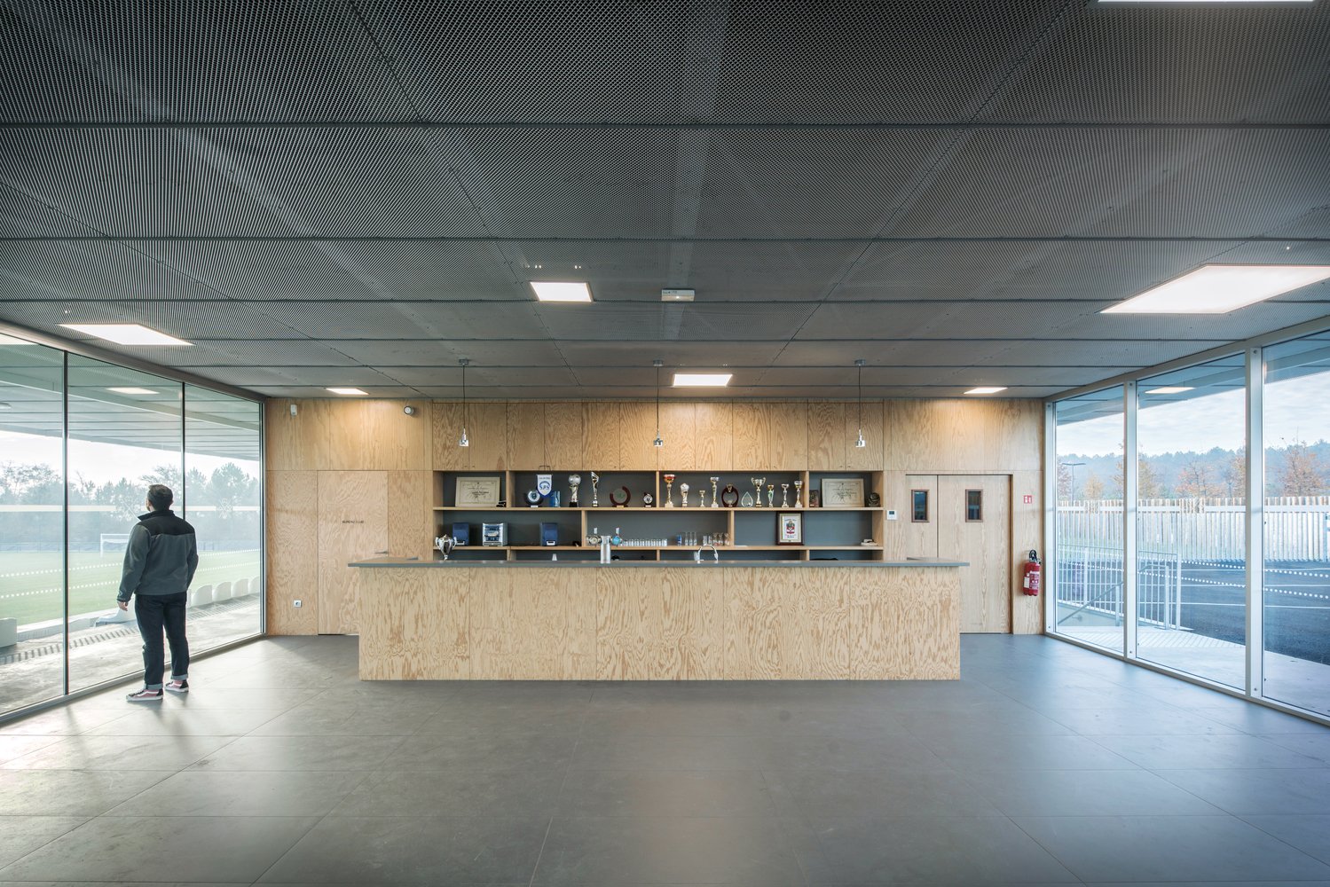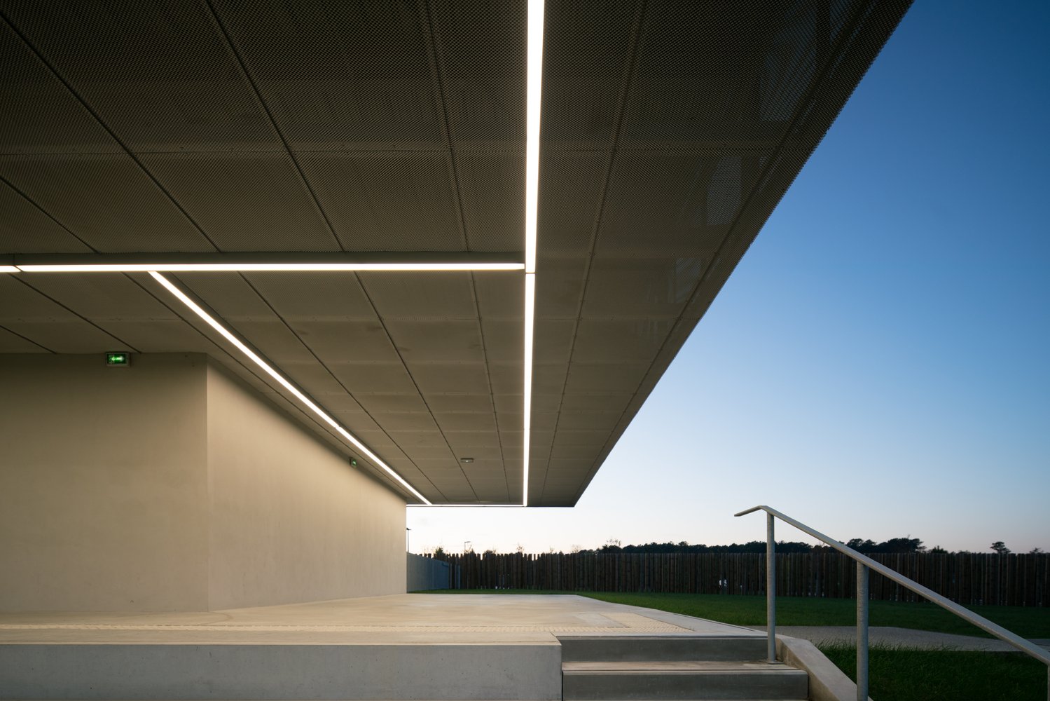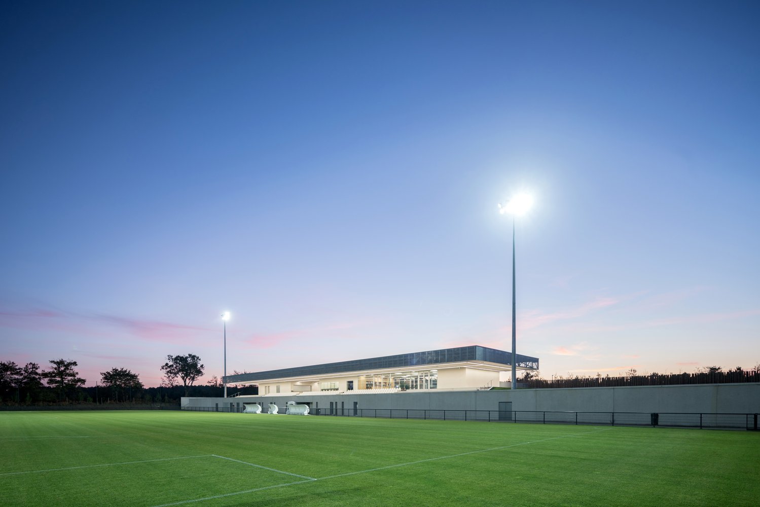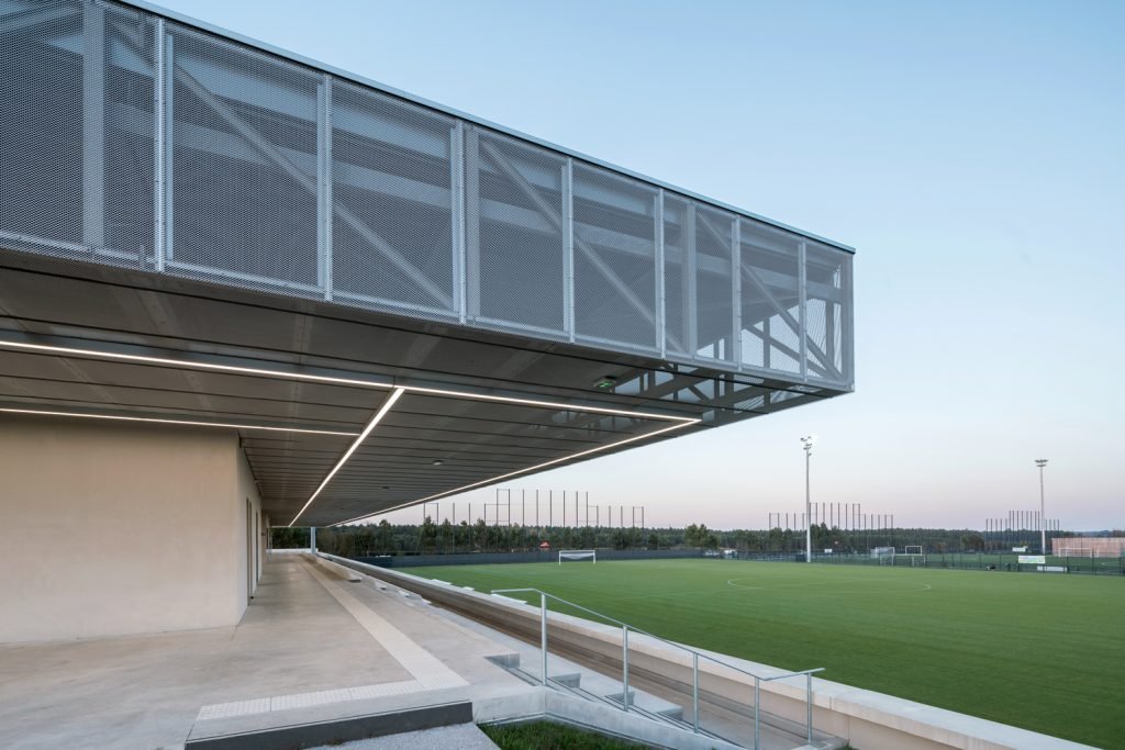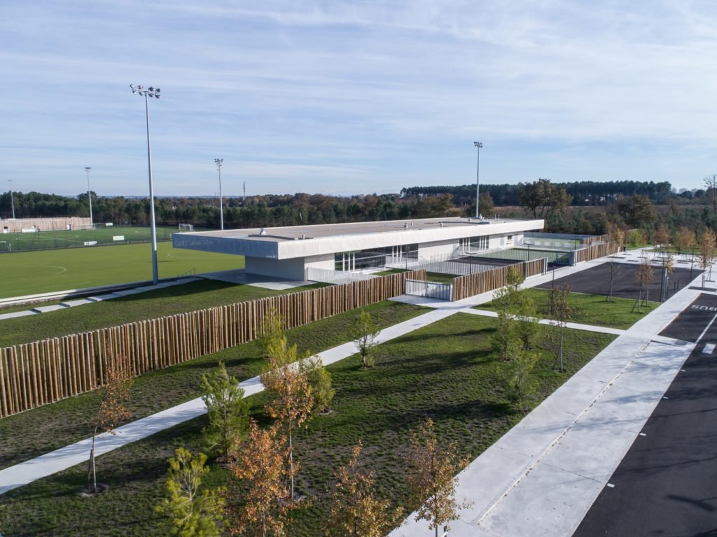 The stand acts as an architectural signal, a line in the landscape visible in both directions from the 824 Departmental Road. Perpendicular to the road, its location makes it visible in a “green tracking”, a careful balance between planting and the presence of technical equipment (lighting masts, ball nets).
