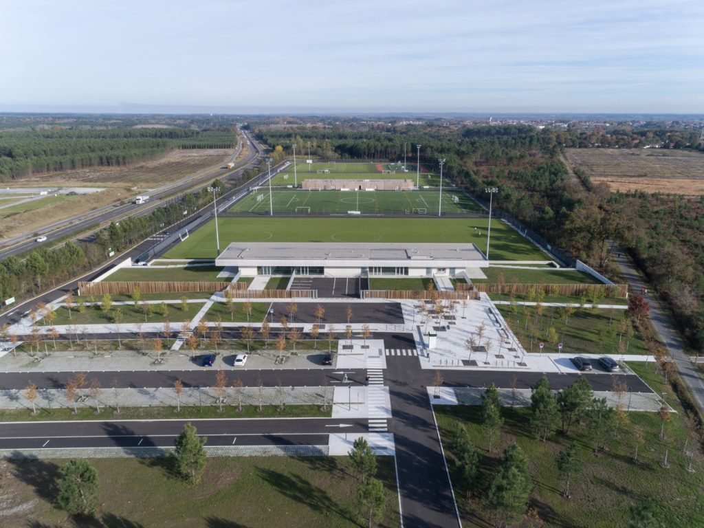 The sports complex includes 4 rugby and football fields, a 500-seat stand, changing rooms, a clubhouse, a children’s playground, a multi-activity area with an athletics track, and a freely accessible sports/nature area.